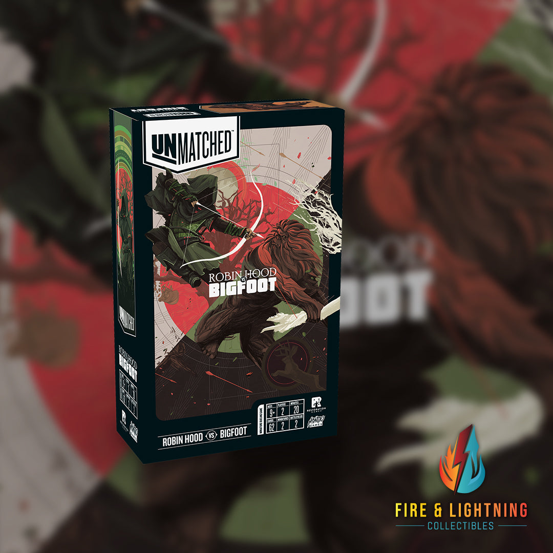 Unmatched is a highly asymmetrical miniature fighting game for two or four players. (Note that this set is solely for two players, but it can be combined with other sets, which all serve up to four players.) Each hero is represented by a unique deck designed to evoke their style and legend. Tactical movement and no-luck combat resolution create a unique play experience that rewards expertise, but just when you've mastered one set, new heroes arrive to provide all new match-ups. Robin Hood vs. Bigfoot features the titular heroes. Robin Hood and his outlaws excel at ranged attacks and robbing from their opponents. Bigfoot and his pal, the Jackalope, crash through the forest for quick attacks before disappearing like a figment of the mind. Combat is resolved quickly by comparing attack and defence cards. However, each card's unique effects and a simple but deep timing system lead to interesting decisions each time. The game also features an updated version of the line-of-sight system from Tannhauser for ranged attacks and area effects. This stand-alone expansion can be played on its own or combined with other expansions or core sets to add more players and new match-ups!